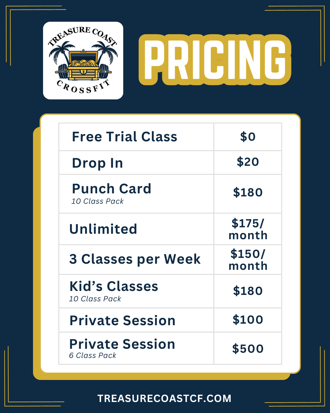 We believe pricing should be simple and honest. At Treasure Coast CrossFit, our rates are clearly listed because we respect your time and your trust.